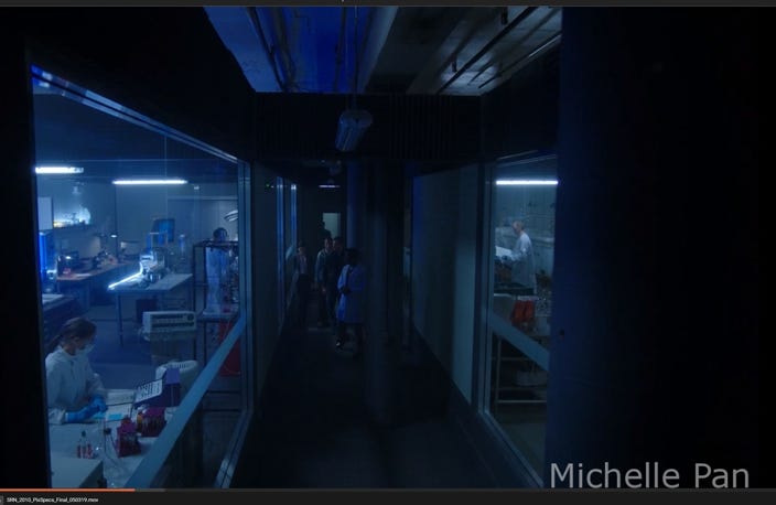 We decided to incorporate a Naval Research Facility into our Siren world. The old Andre’s Wine facility in Port Moody allowed us to have a very stark, glass and wall lab structure, with long hallways and low lighting. We were stuck with the concrete pads that were built for wine making, but Baron Shaver Construction and I came up with a fairly cool working environment .. It needed to be open to view, but isolated in feeling also …