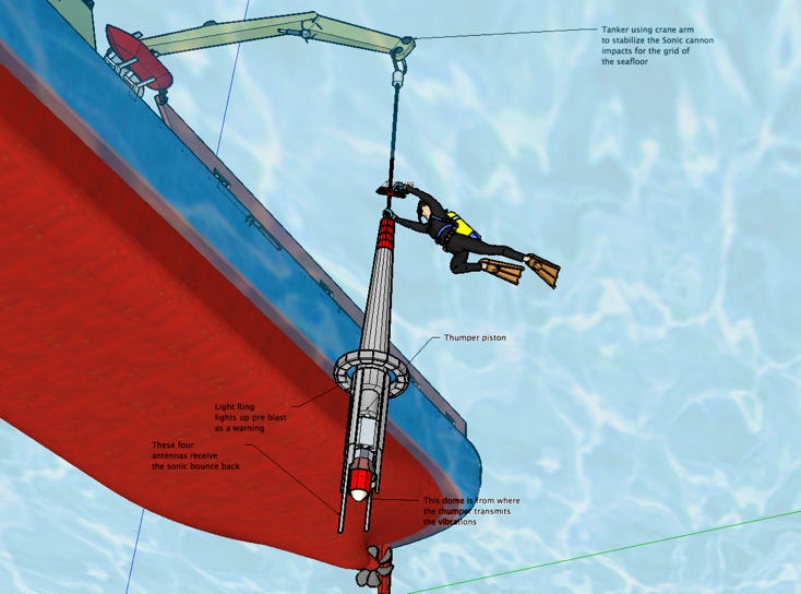 Second season also had a sub plot of an oil drilling platform ship out off the coast in Mermaid territory . The sonics from their research probes was killing the mer folk and had to be stopped . I designed a sonic cannon that was slightly over the top, but it worked fairly well both in the tank and in VFX …