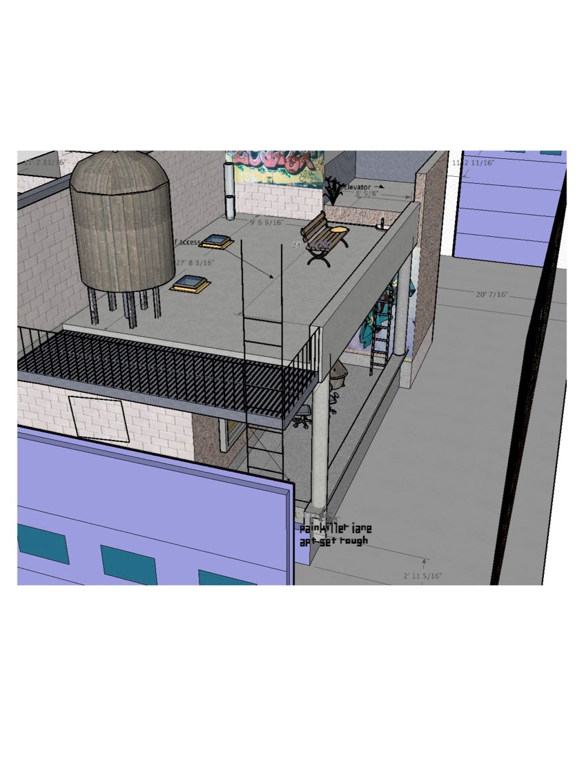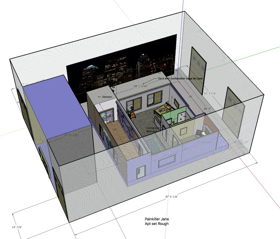 Below please find final design drawings for the Painkiller Jane Series main sets. I designed and we built a full Subway station and short tunnel with an on track remodeled Train car medical lab. In an adjoining building we built Jane’s squatter pad with a working elevator and fire escape. Included in the drawings are some Weapon designs and assorted graphics and misc. other work. It was amazing designing a different future earth. Great, great construction work by Sets Plus’s Brilliant Randy Taylor and teams.