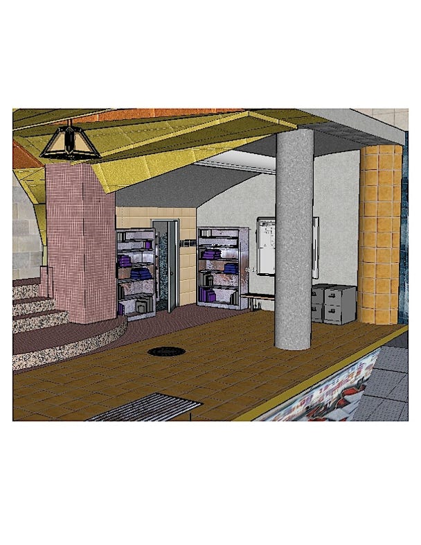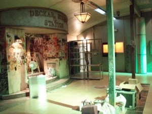 The Subway station, the tunnel and the train were all designed and built in a fairly tiny commercial space. I endeavored to give it a mini Grand Central feel. We used real tiles and classic details that were tarnished by time, misuse and neglect.