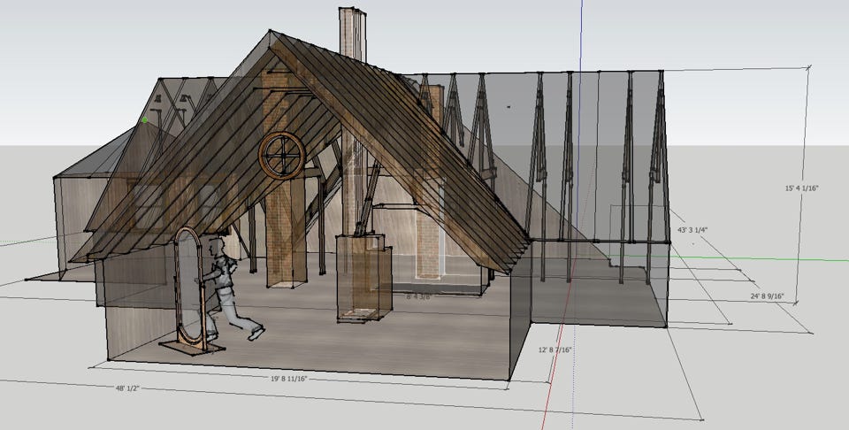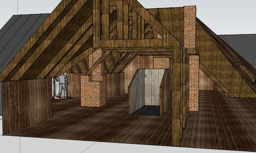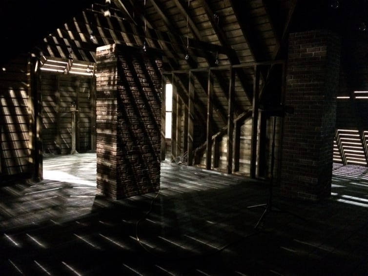 The Attic set was very important as it had to play not only for the nexus between realities, but we had a 4 person cast who had to be seen and at the same time be hidden when scripted. Also the mirror had to be clearly fixed but not in the center of the room and the observation device had to have its own small wing .. so fairly high ceilings and raised side walls…