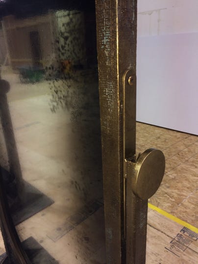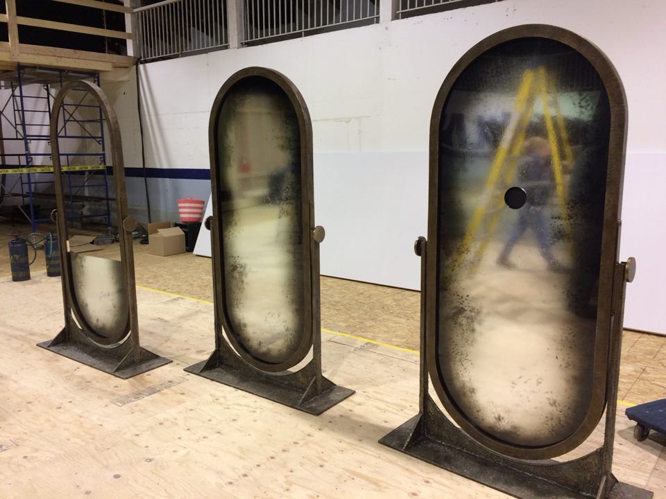The Mirror was the “cursed” object that allowed for the characters to be able to travel between dimensions . I designed it with the feeling that it was from another time itself. We found some great Sandscrit/Egyptian style raised wallpaper and used that to give a carved look to the “bronze”