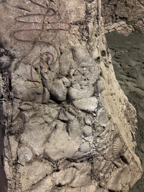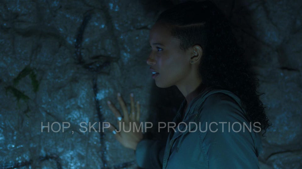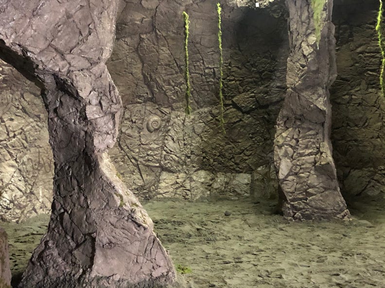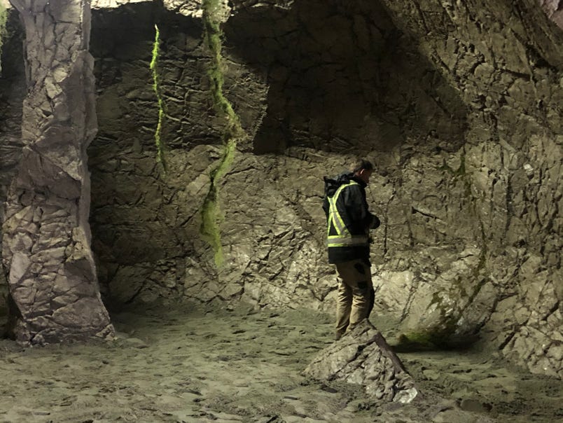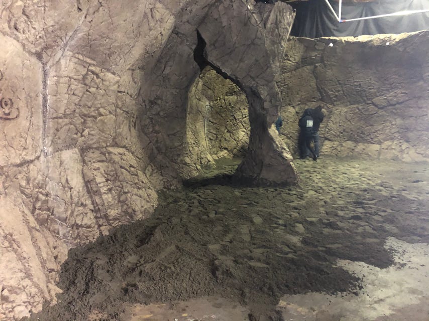 For EP 206 it was also scripted that we needed a larger cave set, so Baron built it at our Andre’s stage .. It was longer, higher and no ceiling. This time Director Amanda Row wanted a bit one sea related fossils and iridescence in the rocks .. Cam and team (Vincent Prokop and Kat Gunn scenic artists) made it all look great ..