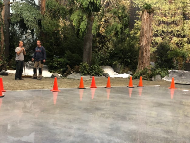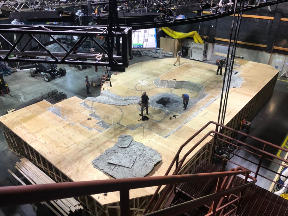 Baron Construction and teams made use of rolled polymer sheets , cut irregularly and layered to show ice breakup and expansion … It looked great, and shot well although the reflections of the above lighting needed some additional VFX magic..