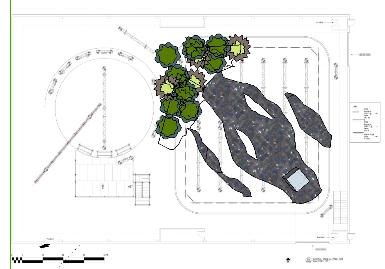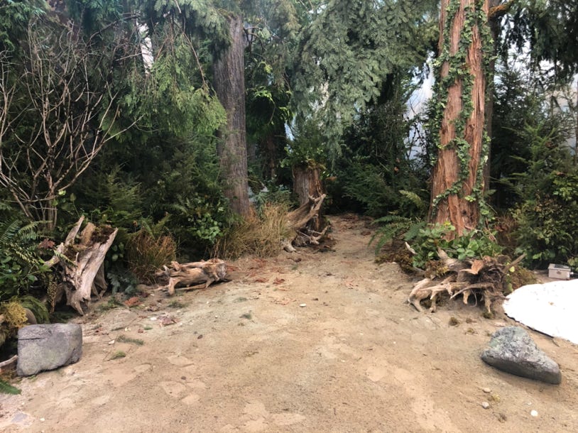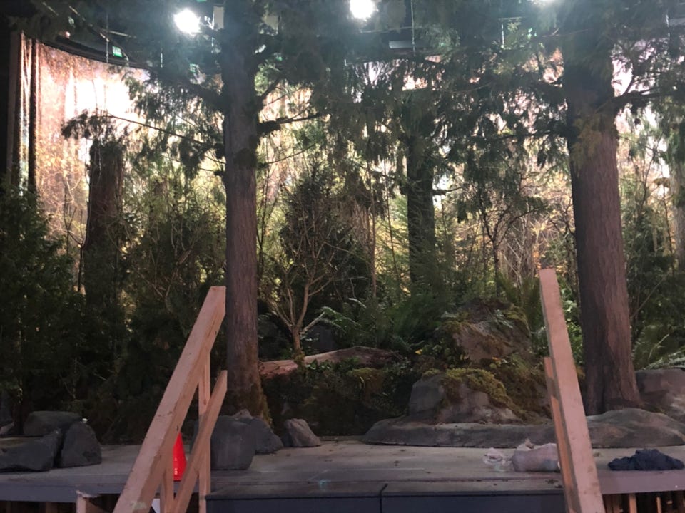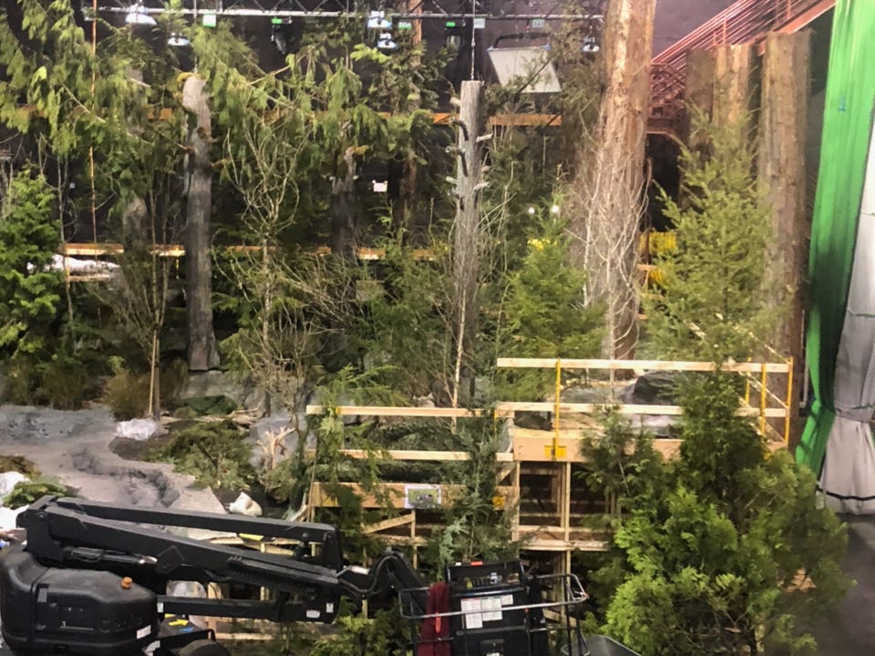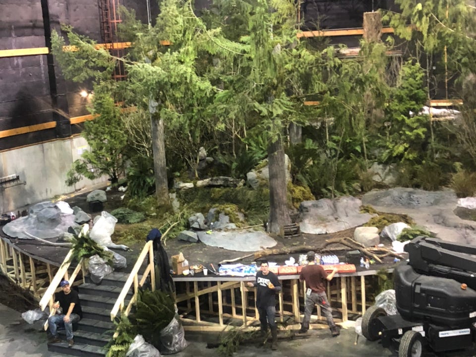 Next was the monumental Alaskan Rain Forest set, built on a 72’ wide x 40’ deep raised platform. The platform needed to be super strong to handle the greens and aggregate load, a ceremonial pool, and at the same time showed exposed rocks … plus it had to be safe for crew building and detailing, but also for shooting crew in dim light to be safe … Greens did a heroic job, with help from grips and construction, with huge trees and rocks .. amazing …..